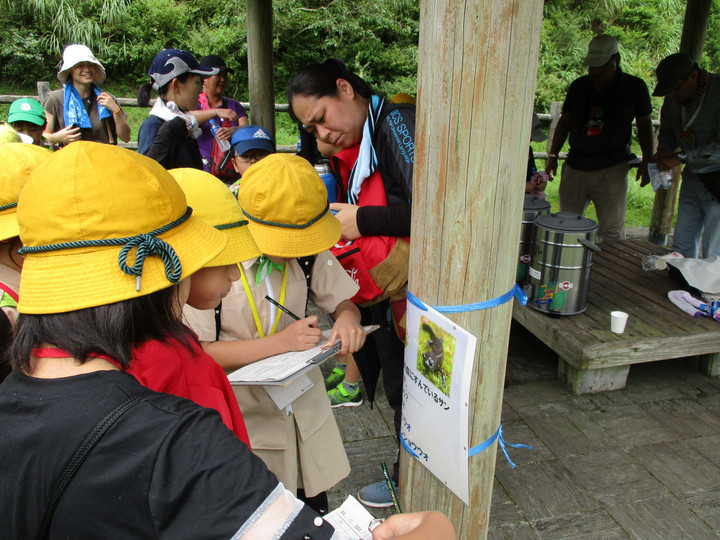 本日、肝属地区緑の少年団実践交流集会が、錦江町と南大隅町にまたがる照葉樹の森で開催されました。鹿屋市の横尾岳緑の少年団、錦江町の大原緑の少年団、南大隅町の佐多小緑の少年団の3団体が参加しました。午前中は照葉樹の森を散策しながらクイズを解いたりして、午後からは照葉樹の森内にあるビジターセンターに場所を移して、木工体験活動を行いました。3団体入り混じった班ごとに森林散策と木工体験を行い、お互い協力しながら、怪我なく、仲良く交流集会を終えることができました。森林にふれあい、夏休みの良い思い出ができたのではないかな、とうれしく思いました。照葉樹の森は標高が高いため、午後からのビジターセンターでの活動は雲の中での活動となり、子供達や保護者の方々も喜んでいました。とても楽しい一日でした。